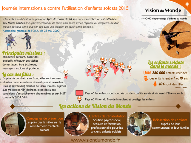 - Actualité et rappel : Jeudi 12 février : Journée mondiale contre l’utilisation "d’enfants soldats". (Association Vision du monde) - 250 000 enfants soldats sont recrutés chaque jour aux côtés des forces armées dans le monde : des enfants âgés de 7 à 18 ans, dont 40% de filles..sont des enfants soldats.